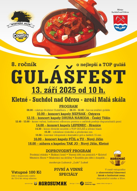 Je sobota 13. září a nebe nad Saloonem Kletné nevěští nic dobrého, přesto je zde od rána nebývale rušno. Není se co divit, brzy začne 8. ročník vyhlášeného Gulášfestu. Soutěžní týmy připravují své stánky, Western klub natahuje poslední elektropřívody a připravuje vše potřebné pro zdar celé akce. V osm hodin svolává moderátor Ríša Ehler soutěžní týmy před Saloon, aby si převzaly identifikační karty a dává jim informace ohledně organizace festu a přípravy gulášů. Konkurence je veliká, je celkem 10 soutěžních týmů, které do soutěže přihlásily 13 gulášů. Ještě nezbytné foto soutěžních týmů a Miloš Bidlo výstřelem z pistole zahajuje vaření gulášů. Týmy se rozprchly do svých stánků a za chvíli se už kouřilo ze všech kotlíků. V 10 hodin na velkém pódiu začal první koncert kapely Neprak a co jsme nechtěli, spustil se i déšť. Blesklo nám hlavou, že po loňském roce, kdy jsme kvůli počasí museli Gulášfest zrušit, že to bude zase průšvih. Děkujeme, že se tak nakonec nestalo, s blížícím se polednem déšť ustal a areál se začal plnit návštěvníky a tak druhá kapela (snad symbolický moment) s názvem Druhá náhoda hrála již pro dost diváků. Při vstupu do areálu po zaplacení vstupného dostal každý návštěvník degustační balíček, hlasovací lístek se vstupenkou a na ruku identifikační pásku. Každá vstupenka byla později slosovatelná a bylo možno vyhrát pěkné ceny, hlavní cenou byl kontaktní gril. Areálem se v té době šířily libé vůně připravovaných gulášů, všude se již ve skupinkách živě debatovalo, občerstvení na Saloonu jelo na plné obrátky. Kolem 13 hodin začal ve stáncích prodej degustačních porcí návštěvníkům, stánky začala obcházet i odborná porota. Návštěvníci hodnotili pomocí hlasovacích lístků TOP guláš, odborná porota hodnotila NEJLEPŠÍ guláš. Další kapelou, která vystoupila na velkém pódiu, byl Lepenec, v přestávkách mezi kapelami probíhaly u velkého pódia soutěže pro malé i velké diváky, byl tu oblíbený hod kloboukem na věšák a hod válečkem a vařečkou do hrnce. Zdá se to být jednoduché, ale neposlušné válečky a vařečky vyskakují z hrnce a klobouky ne a ne se chytit na věšáku. Jirka Vlče nám ve svém vystoupení předvedl, jak náročné a krásné je umět ovládat různě dlouhé biče. Poslední koncert na velkém pódiu měla kapela Fčil a Tu a poté nás svým kouzelným hlasem přišla potěšit v krátkém vystoupení 17 letá zpěvačka Kristýnka za doprovodu Daniela, Kristýnka bude soutěžit v televizní Superstar. Odborná porota mezitím zasedala v Saloonu, kde vyhodnotila soutěž o NEJLEPŠÍ guláš, v 16 hodin pak skončilo i hlasování návštěvníků o TOP guláš. Po sečtení hlasů bylo slavnostní vyhodnocení výsledků soutěže pod taktovkou moderátora před velkým pódiem. No a kdo vyhrál ? U návštěvníků i poroty vyhrál tým Valaši, za originální stánek získala 1. cenu Jedová chýše. Vyhlášením vítězných týmů soutěže Gulášfestu program nekončil, před Saloonem na malém pódiu hrála k tanci i poslechu kapela Tak jo. Děkujeme návštěvníkům, že v náročném rozmoklém terénu vše bezvadně zvládli a podrželi si dobrou náladu do pozdních večerních hodin, kdy za deště tančili a tleskali kapele Tak jo.